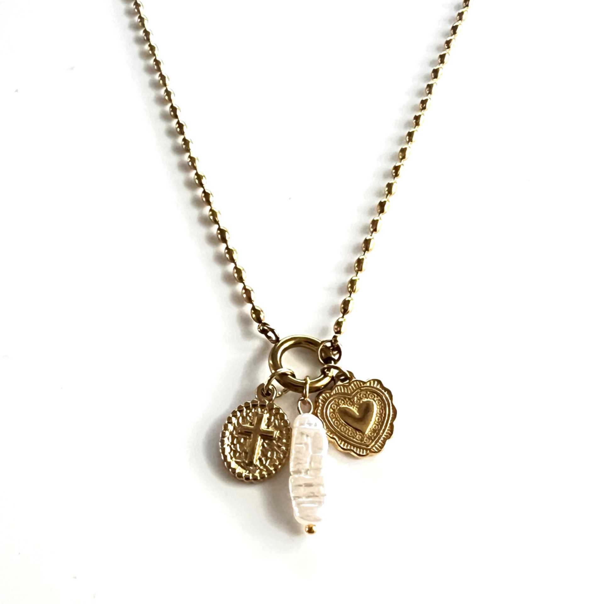 Ketting boeislot met kruis, hart en parel bedel 18K Verguld