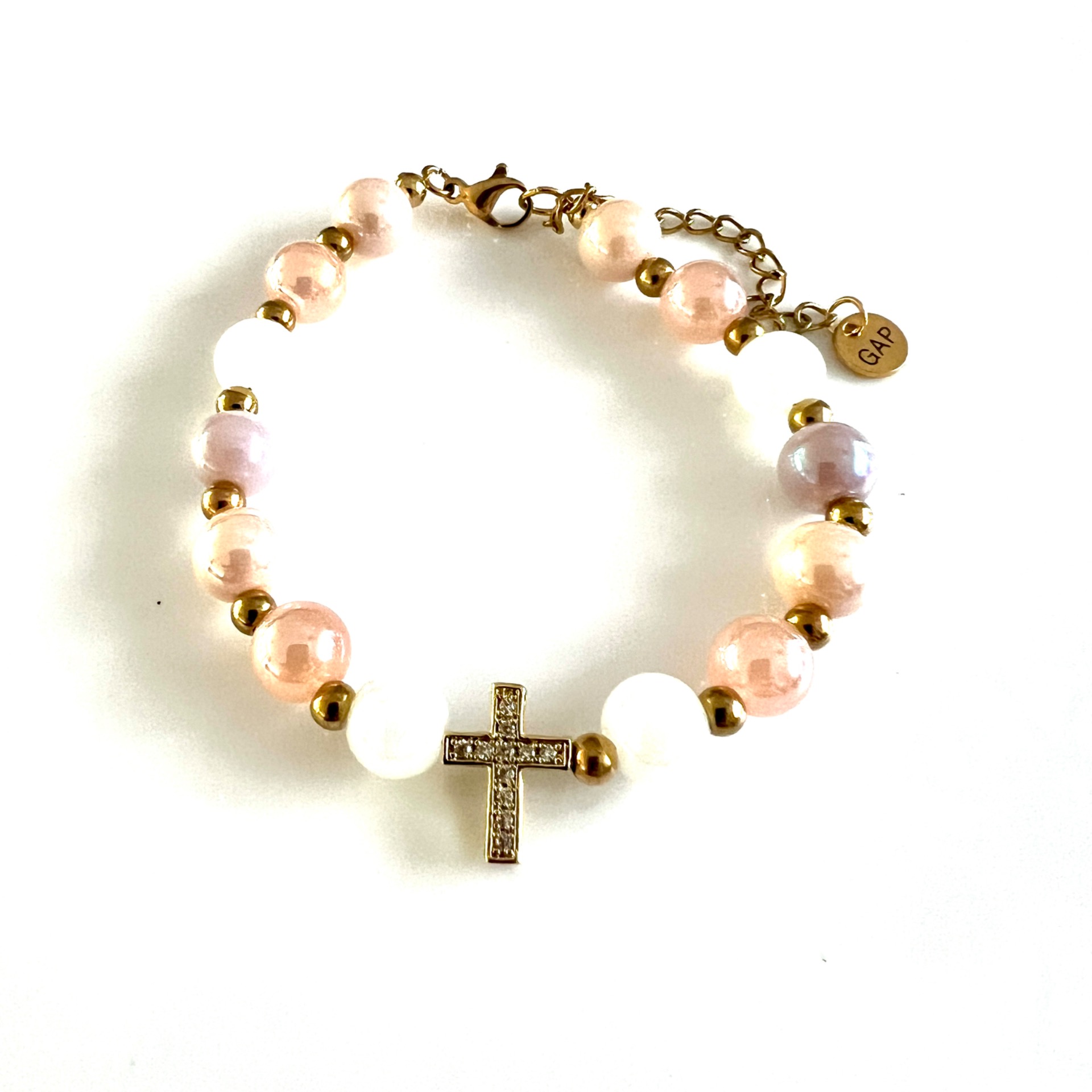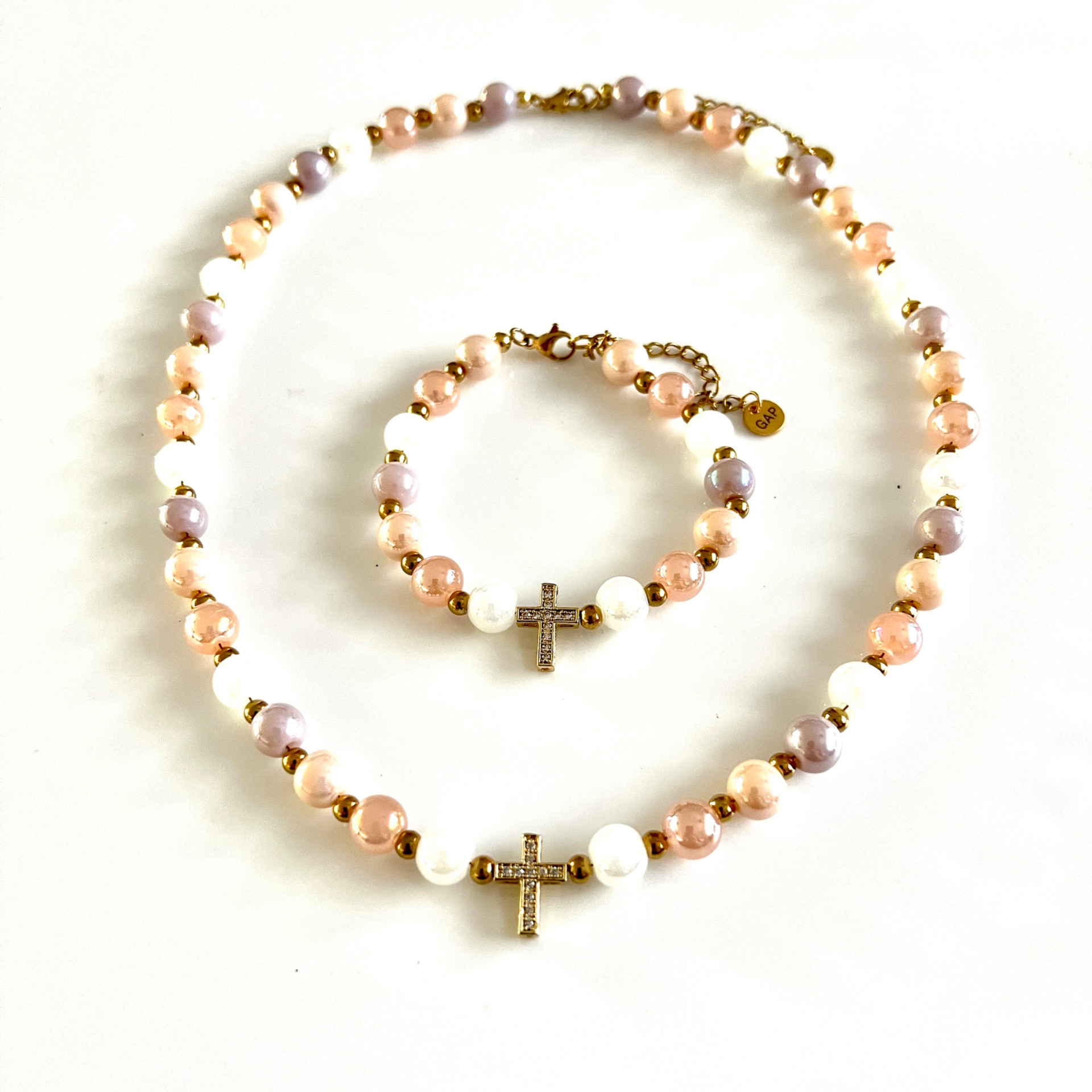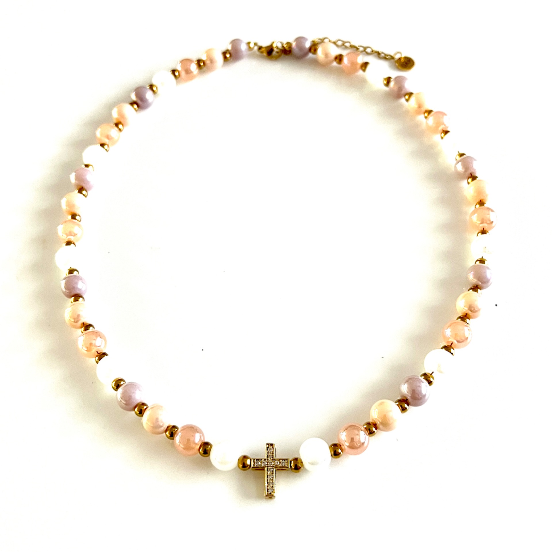 Imitatie parelketting met een met strass ingelegd kruisje en RVS accenten