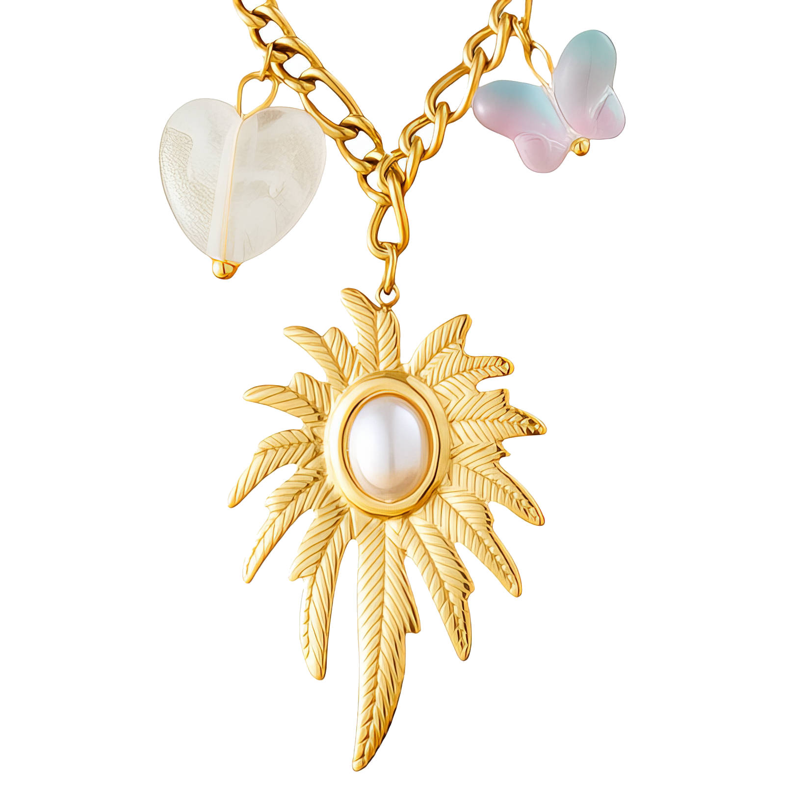 Met diverse bedeltjes, waaronder een duif, hartje, palmboom met parel hart, vlinder, zonnetje en een strik