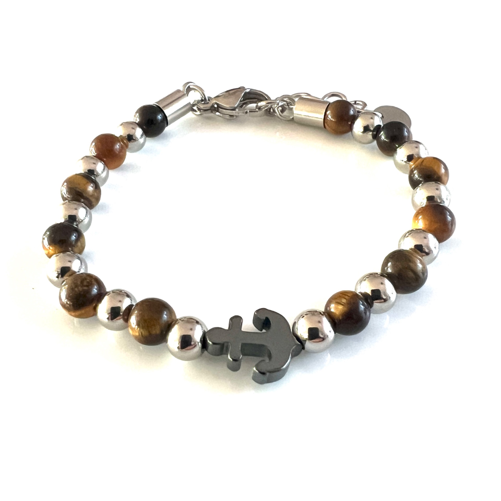 Armbanden van roestvrij staal en natuurlijke tijgeroog met ronde kralen, Anker van hematiet.