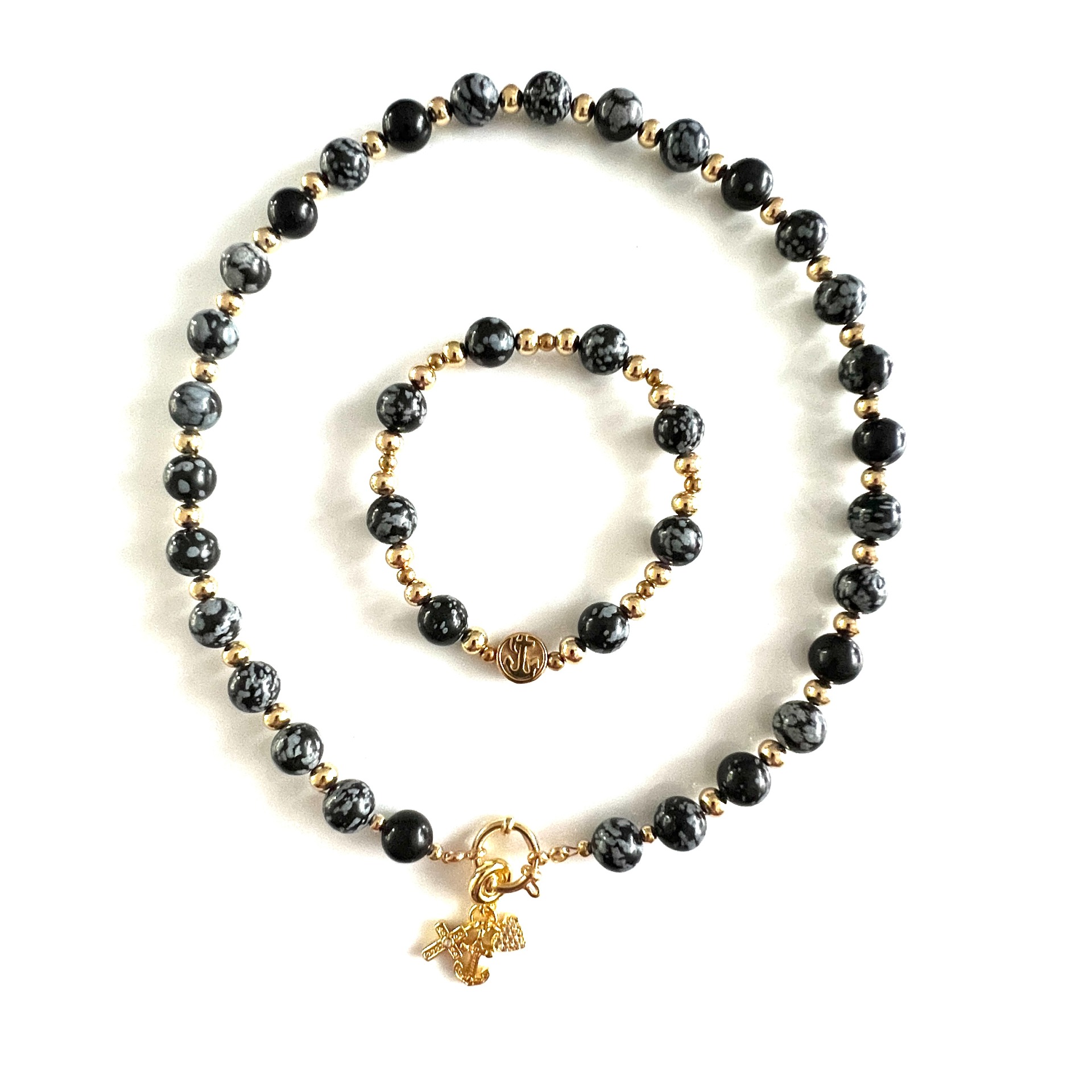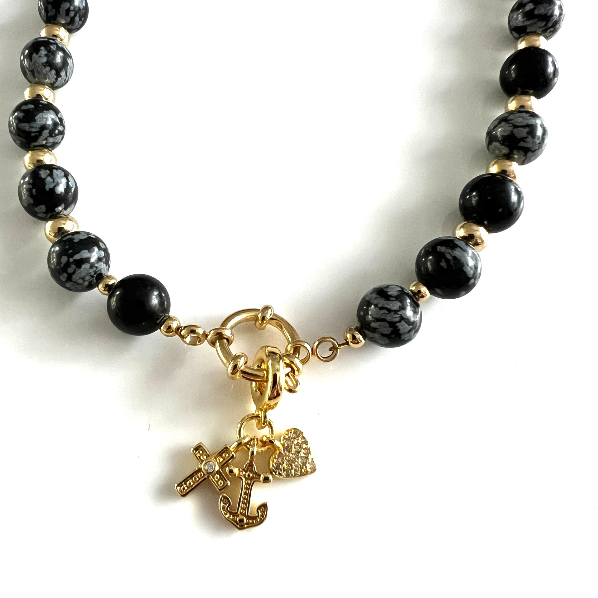 Kralen ketting met zwart/grijze kralen en rvs kralen.