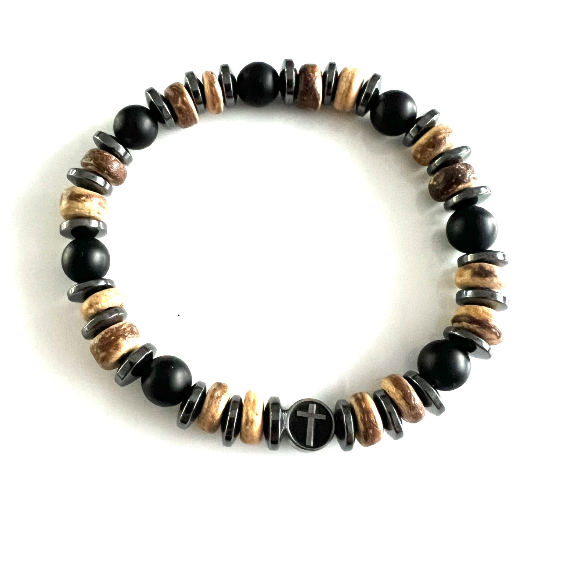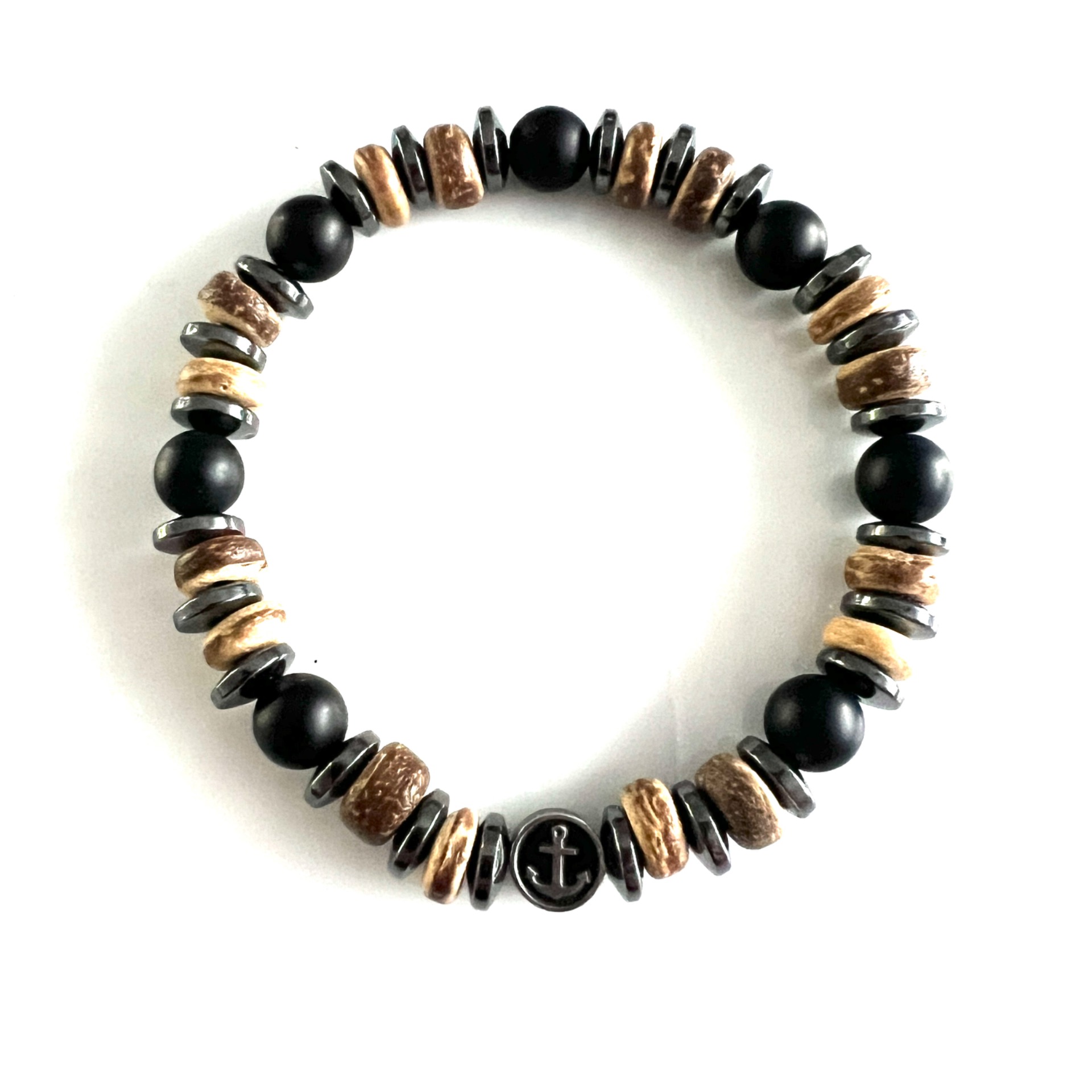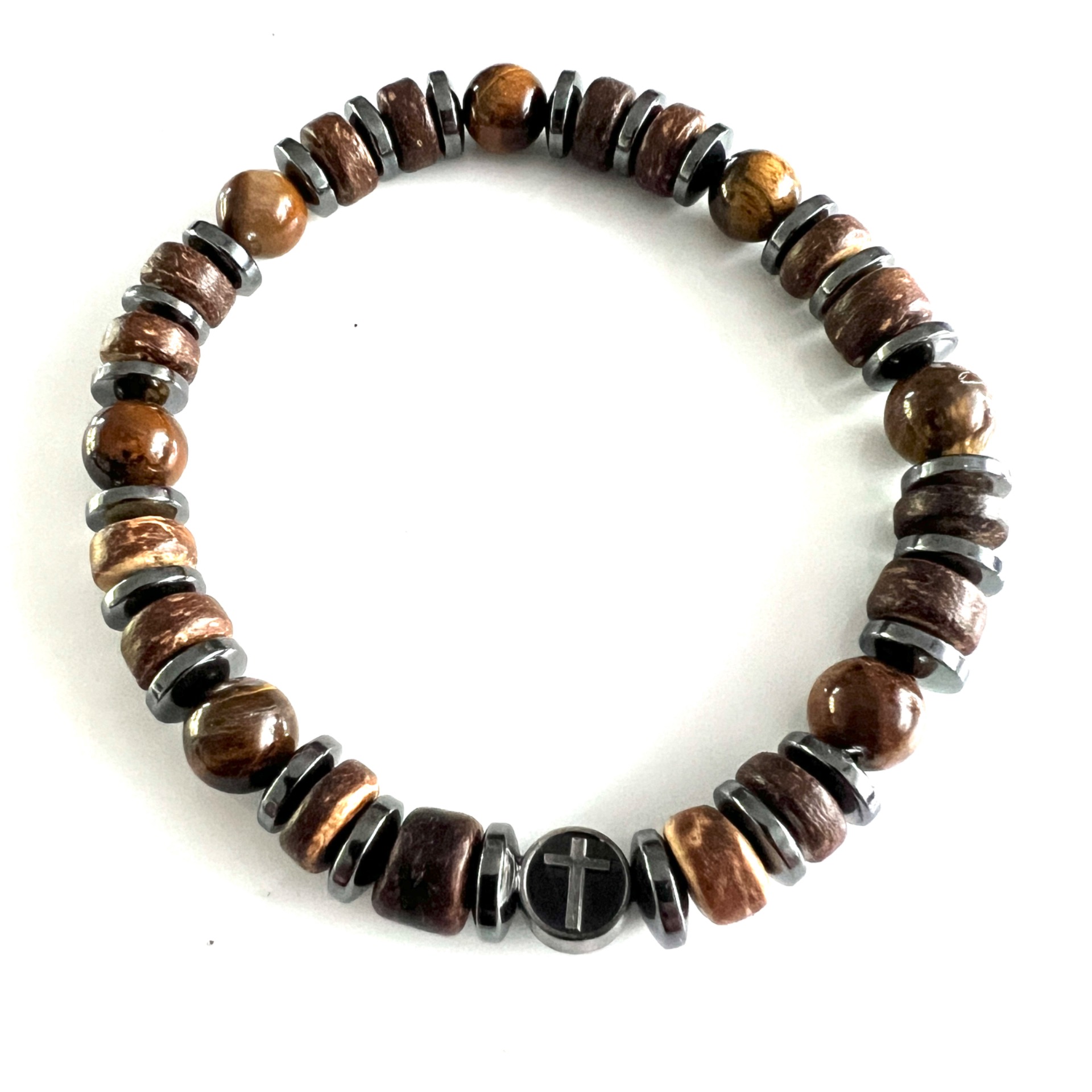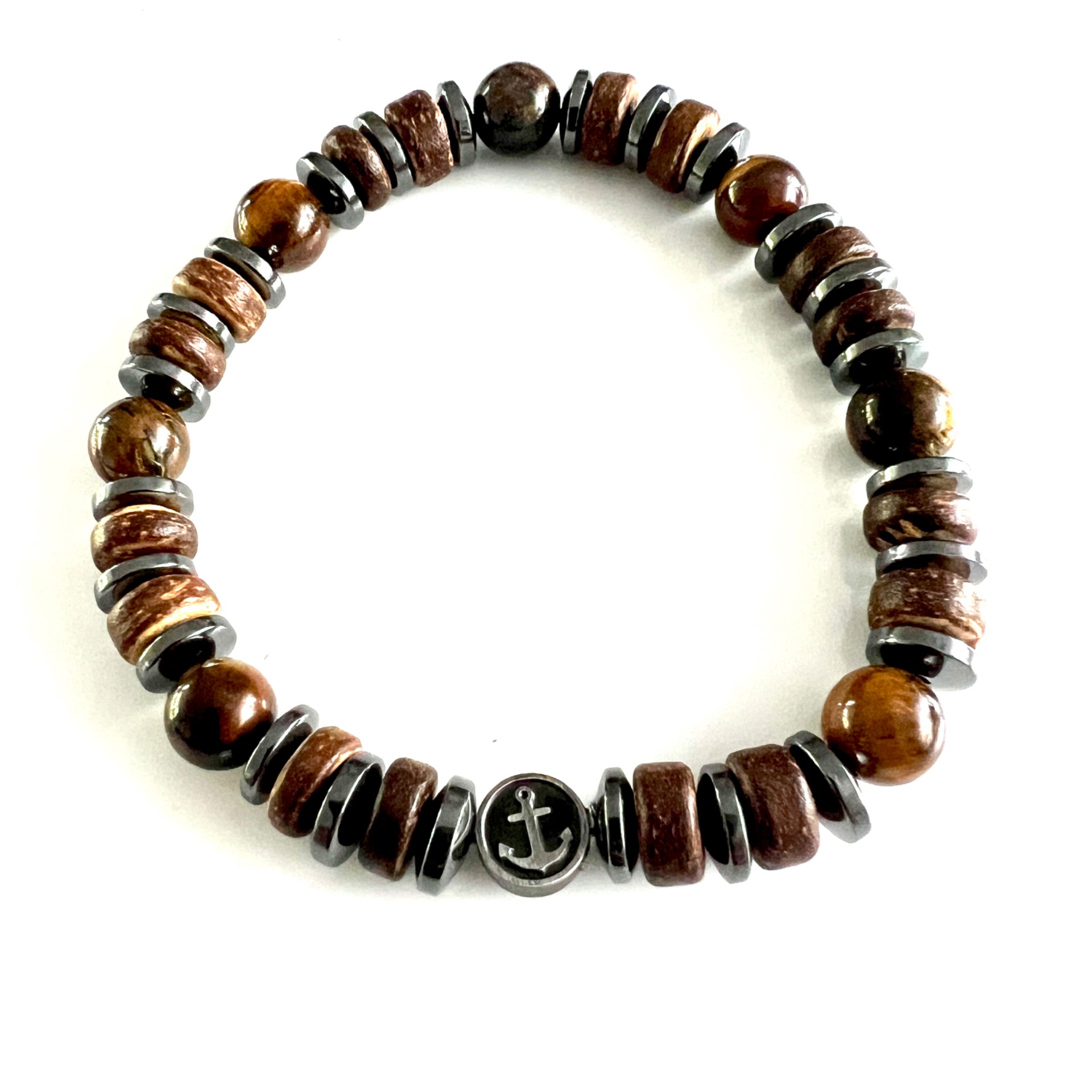 Kralen armband van hout- natuursteen- en hematiet kralen
